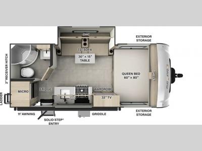 This is the perfect couple's trailer, so sneak away for a weekend in the woods. There is a 72" sofa with cupholders with a 30" x 15" table that will be perfect for meals times and relaxing. This model includes a 12V Smart TV to keep you busy on those rainy days, and the queen bed will provide a great night's rest. You will also be able to have a full bathroom with a radius shower, toilet and vanity sink, so you don't have to rely on campsite facilites. This model also includes an 11' power awning so you can enjoy those nice days outdoors!