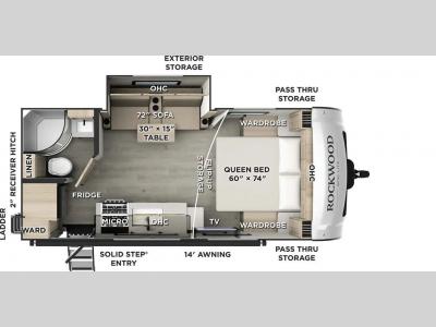 Sleeps 3 Slides 1 Length 22 ft 4 in Ext Width 8 ft Ext Height 10 ft 3 in Hitch Weight 557 lbs Dry Weight 4493 lbs Cargo Capacity 1344 lbs Fresh Water Capacity 54 gals Grey Water Capacity 29 gals Black Water Capacity 29 gals Furnace BTU 20000 btu Available Beds RV Queen Refrigerator Type 12 Volt Cooktop Burners 3 Number of Awnings 1 LP Tank Capacity 30 lbs Water Heater Type Quick Recovery AC BTU 15000 btu TV Info LR 12V TV Awning Info 14' Power with Adjustable Rain Dump and LED Lights Axle Count 2 Number of LP Tanks 2 Shower Type Radius Solar Wattage 200 watts Similar Travel Trailer Floorplans