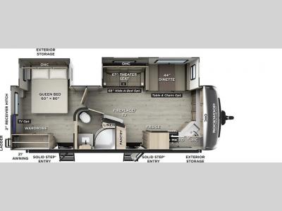When you are outside this trailer you can enjoy the protection from the 21' power awning, you will also find exterior storage for your extra gear, and a ladder at the rear. You get to choose which entrance to step up into, be it the spacious rear bedroom with a queen bed slide and a wardrobe, or the main entry into the kitchen and living area. The furniture slide includes a booth dinette to eat your meals at, and theater seating to watch the Smart TV with a fireplace below. And the cook will love the front kitchen with extra counter space, a three-burner range, plus a 12V refrigerator and pantry for food storage!